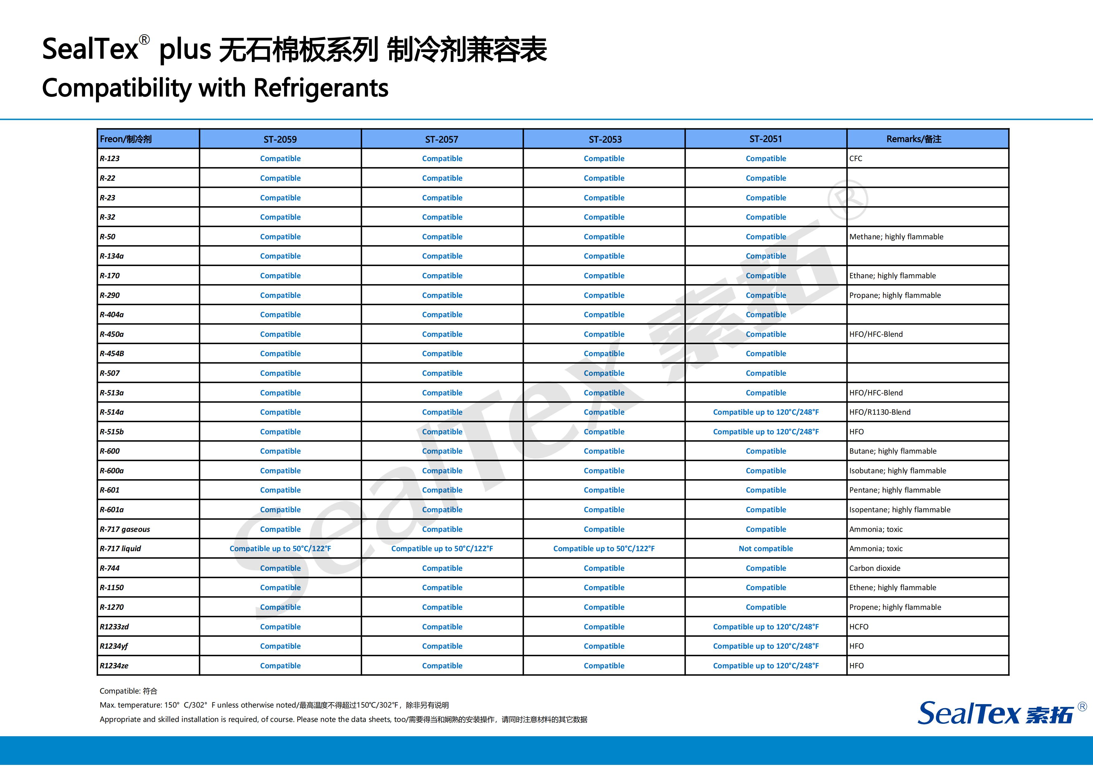 對于密封式和半密封式制冷壓縮機來說,每類制冷壓縮機可能會用到不同的制冷劑,一個能完全遏止制冷劑的可靠性密封系統是決定壓縮機長期穩定運轉的重要因素。SealTex索拓公司為滿足制冷壓縮機用戶的要求,特別推出能在各種法蘭壓力下保持卓越密封性能的無石棉密封材料以滿足市場的需求。這些產品非常適用于半密封式壓縮機、冷卻裝置,對螺桿式和往復式壓縮機的應用尤其適合。例如:ST-2059、ST-2057、ST-2053、ST-2051.