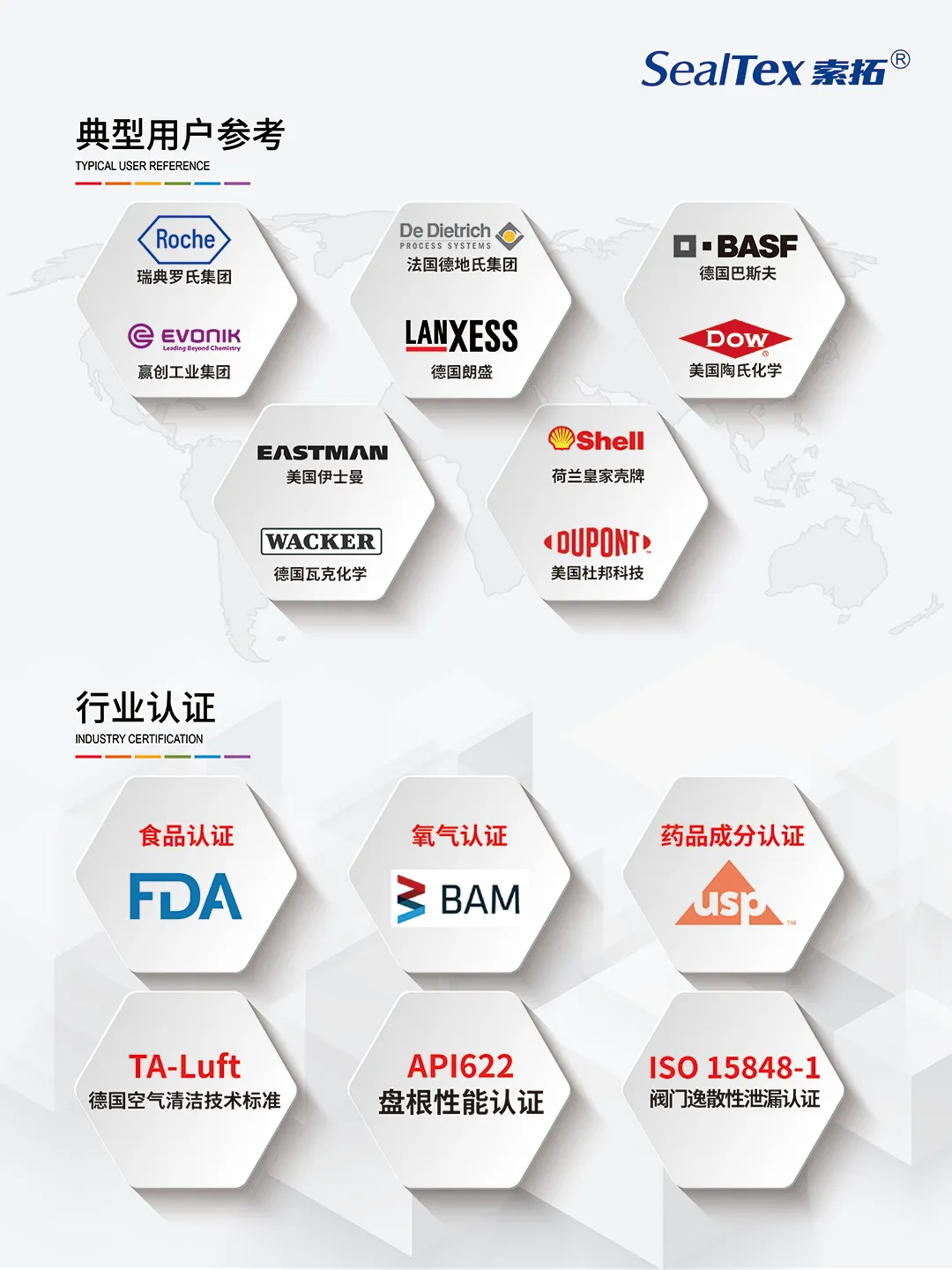 我司代理合作品牌TEADIT泰迪已為全球多家知名化工企業提供密封解決方案服務,例如:BASF巴斯夫、Shell殼牌、Roche羅氏等。且產品可滿足FDA、BAM、DVGW、ups、TA-Luft、API622、ISO 15848-1等不同標準要求。還在耐高溫、耐腐蝕等性能上表現出色,能夠滿足天然氣、石油、化工等嚴苛工況下的密封需求