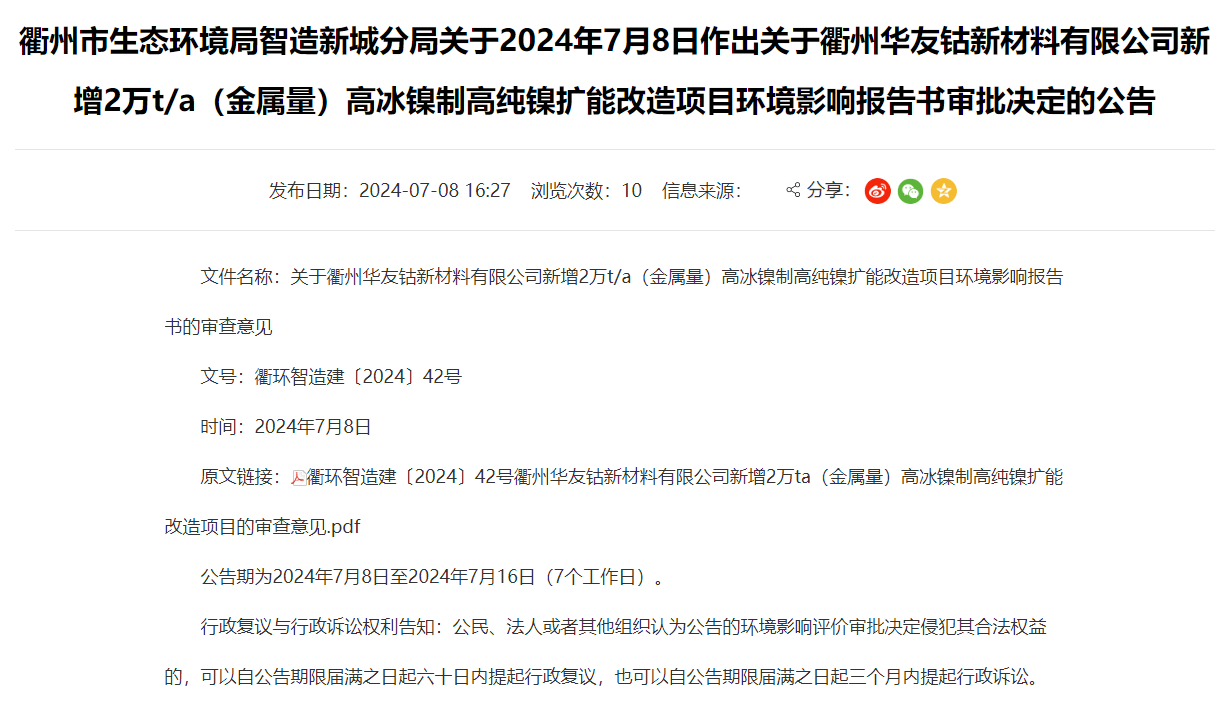 2024年7月8日,衢州市生態環境局智造新城分局就衢州華友鈷新材料有限公司新增2萬t/a(金屬量)高冰鎳制高純鎳擴能改造項目環境影響報告書作出審批決定并對外進行公告,公告期:2024年7月8日至2024年7月16日(7個工作日)。